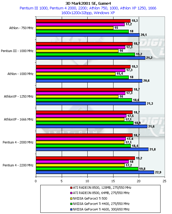 И вот только это разрешение нам продемонстрировало, что у GeForce4 Ti гораздо более высокий потенциал по работе с шейдерами, чем у RADEON 8500, когда влияние центрального процессора уменьшилось.