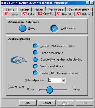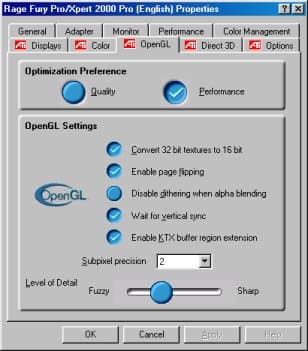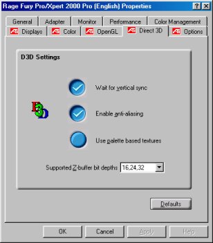 Мы подробно уже описывали все опции при рассмотрении карт на ATI RAGE 128 PRO в наших обзорах, поэтому останавливаться здесь подробно не будем.