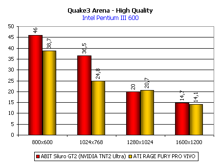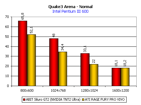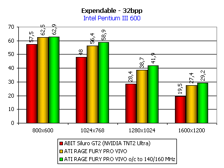 Для наглядности на диаграммах приведены скоростные показатели видеокарты на чипе NVIDIA Riva TNT2 Ultra ABIT Siluro GT2. Почему для сравнения взята карта именно этого класса? Прежде всего, обе карты находятся в одной ценовой категории. И ATI RAGE FURY PRO VIVO, и платы на базе NVIDIA Riva TNT2 Ultra в апреле 2000 года имеют цену примерно 140$. Также мы покажем работу видеокарты ATI RAGE FURY PRO VIVO и при разгоне.