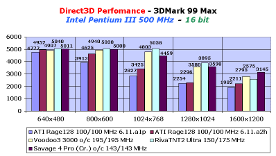 Напомню, что не так давно мы перешли на новый способ тестирования видеокарт в части скоростных показателей, поэтому еще месяц назад я перетестировал все основные имеющиеся на тот момент у нас видеокарты, в том числе и ATI Rage Magnum на базе Rage128. Именно эти показания и вошли в сравнительный анализ по видеоплате Creative 3D Blaster Savage4.