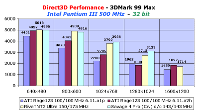 Прирост показателей скорости однозначен и довольно высок, хотя опять-таки революционного ничего не произошло. Единственное, что можно отметить — это обгон Rage128 нового чипсета Savage4.