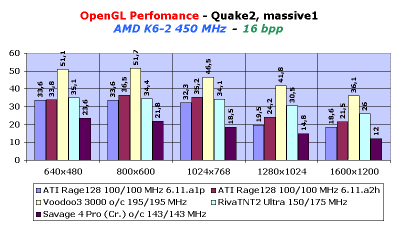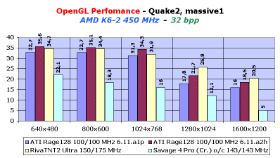 Теперь посмотрим, что же изменилось в работе API OpenGL. Изменения есть, но они не столь революционны по сравнению с Direct3D. Сразу же скажу, что драйвер OpenGL, входящий в состав драйверов 6.11.A2H, вообще почти не дал прироста в скорости. Только драйвер, поставляемый в версии GL1220 (оптимизированный под Quake3), дал положительный эффект. Для чего пришлось файл ati9xaa.dll этой версии скопировать поверх аналогичного файла версии 6.11.A2H. В результате прирост в разных режимах от 2 до 4 fps имеется, но он не дает кардинальной смены общей картины. Хотя должен отметить практическое равенство Rage128 и RivaTNT2 Ultra на системе К6-2 при 32-битном цвете. Ниже мы приводим диаграмы для наглядности.