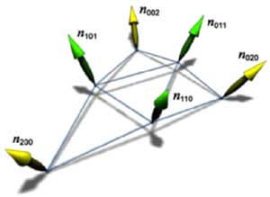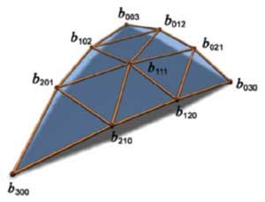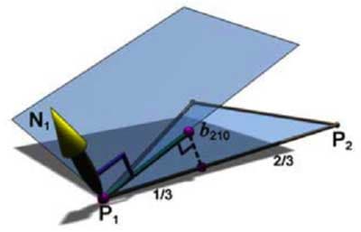 Здесь N1 — вектор нормали, P1 — вершина, получаемая контрольная точка b210 относится к точке P1 и ребру P1-P2. Точка лежит в пересечении плоскости, проходящей через вершину перпендикулярно нормали и через ребро, параллельно нормали, на расстоянии одной трети длины ребра. Вычислив, кроме того, одну центральную контрольную точку, мы получаем следующий набор (10 точек включая вершины):