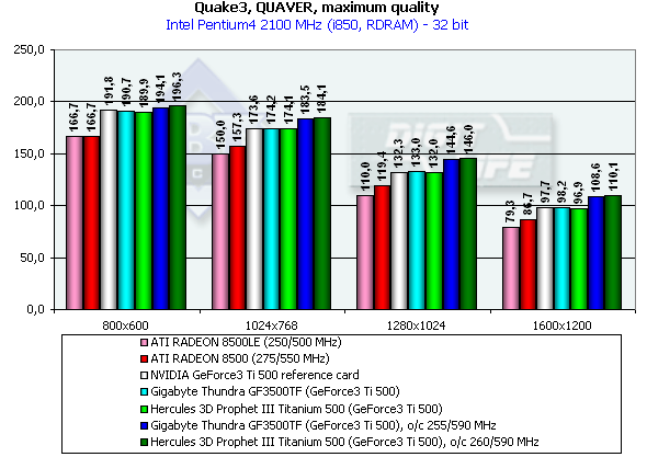 Что касается 2D, то скажу, что к обеим картами замечаний нет. При работе в разрешении 1600x1200 при 85 Гц комфорт был на высоте, глаза не испытывали ощущений усталости и нечеткой картинки. Повторюсь, но скажу: для того чтобы иметь основания пенять на видеокарту и быть уверенным, что в нечеткости виновата именно она, надо пользоваться высококачественным монитором, а также иметь в виду, что все мониторы от 19 дюймов и выше имеют разъем BNC, и следует купить качественный кабель