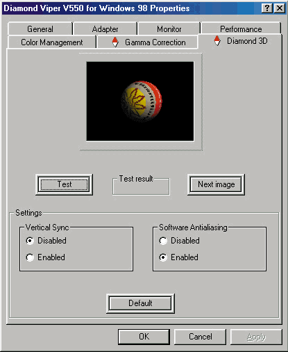 Должен отметить, что драйвера от Creative Labs отличались большей полнотой настроек, но Viper V550 не стала работать с ними, поэтому были использованы для Viper V550 еще драйвера от nVidia Reference Drivers Version 032, но ввиду полного отсутствия в них каких-либо настроек, были установлены для Viper V550 драйвера от Diamond.