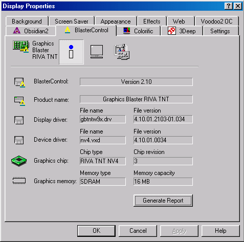 Должен отметить, что эта программа почему-то неправильно определила размер памяти у GB RivaTNT (у Viper V550 все правильно), а также вызывает юмор название пункта "Вторичное 3D лишение", что имелось в виду Secondary 3D Hardware (в машине была также установлена видеокарта Quantum3D Obsidian2 X-24).