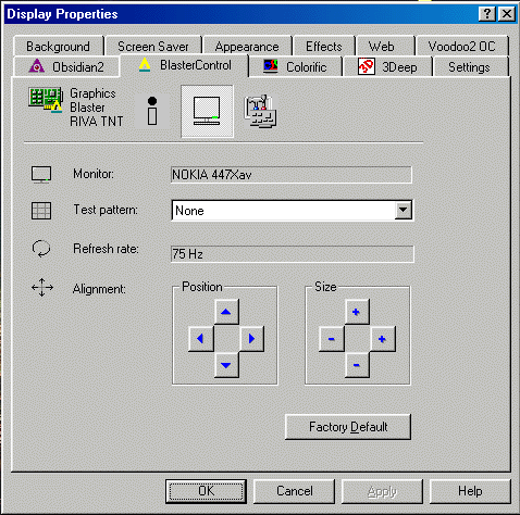 Должен отметить легкость установки драйверов для данной платы, никаких торможений или зависаний не наблюдалось. После установки драйверов в настройках дисплея появилась новая закладка: Blaster Control, которая содержала много параметров настроек видеокарты: