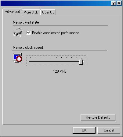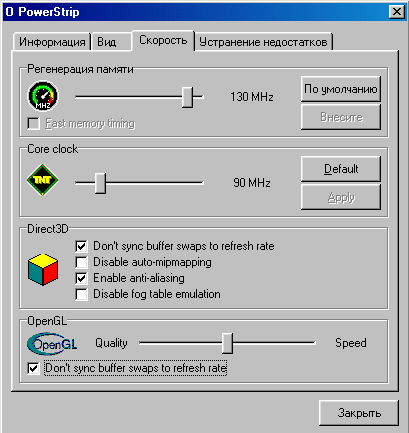 - есть возможность установки частоты , на которой будет осуществляться обмен с памятью видеокарты (до 130 МГц), а также включение самой акселерации 3D-графики ;
