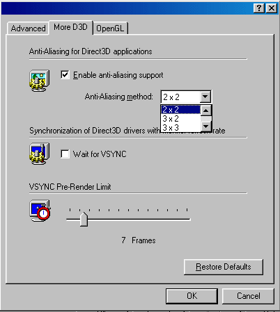 - есть возможность включения эффекта сглаживания (anti-aliasing), а также выбора субпиксельной маски для него, там же можно включить режим согласования частоты кадровой развертки монитора с частотой дискретизации карты (Vsync), а также можно выбрать режим работы при выключенном Vsync;