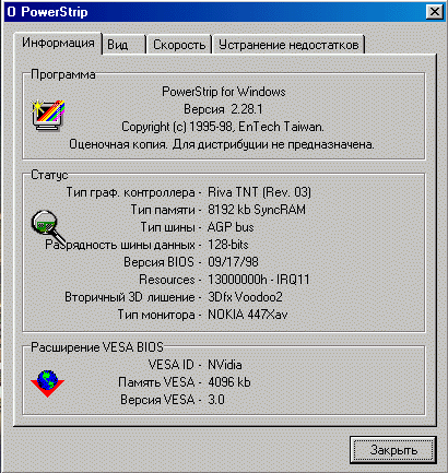 Как я уже сказал, настройки драйверов не дают полной возможности для разгона по обоим направлениям: разгон чипа и разгон памяти. В настройках драйверов Graphics Blaster RivaTNT есть только возможность разгона памяти, а в настройках драйверов Viper V550 вообще отсутствует возможность какого-либо разгона. Поэтому, для такой возможности была взята программа PowerStrip версии 2.28, которая позволяет сделать разгон по обоим направлениям.