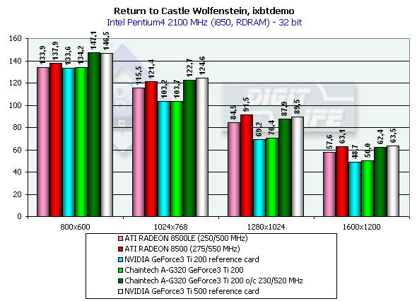 - Return to Castle Wolfenstein (id Software) игровой тест, демонстрирующий работу платы в OpenGL с использованием нами созданного и записанного демо-бенчмарка ixbtdemo.