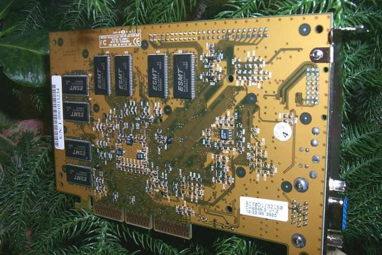 Микросхемы памяти произведены фирмой ESMT и имеют время доступа 5ns, что свидетельствует о том, что данная память может работать на частоте 200 МГц. NVIDIA рекомендует использовать в SDR-картах 166 МГц память, поэтому номинальная частота работы памяти на данной плате (как, впрочем, и на всех остальных картах этого класса) понижена до 166 МГц.