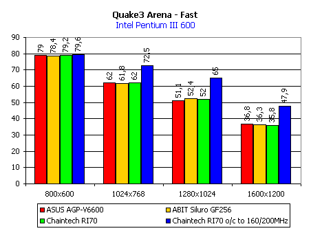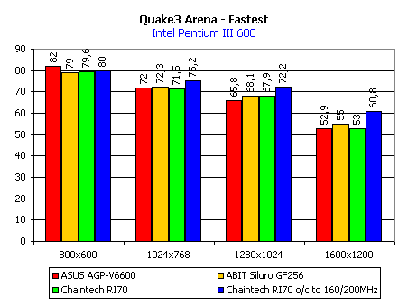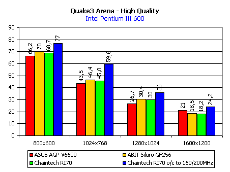 Как можно видеть, скорость видеокарты Chaintech Desperado RI70 мало отличается от производительности аналогов, чего и следовало ожидать от платы, полностью сделанной на основе reference-дизайна. А вот работа на разогнанных частотах выделяется. Прирост по скорости весьма существенный, особенно это заметно в игре Quake3. Тем не менее, более разгоняемые карты, в частности ASUS AGP-V6600 и Leadtek WinFast GeForce256, при оверклокинге показывают еще более значительный прирост.