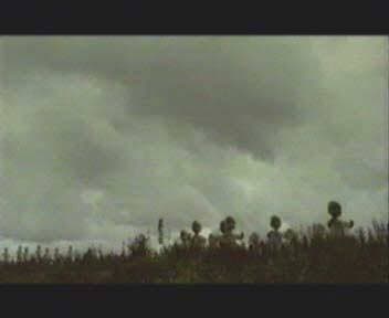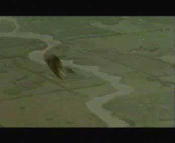 Итак, вернемся к нашим баранам. На этой картинке изображен первый эпизод с применением компьютерной графики (это — не 3D). Дело в том, что при съемках клипа у режиссера не было соответствующего оборудования для проведения съемок ландшафта с больших высот, но в клипе обязательно было необходимо как-то показать масштабность происходящего. Было принято решение создать компьютерный вариант ландшафта, чтобы потом, масштабируя его добиться эффекта взлета видеокамеры на большую высоту. Растр высокого разрешения был выполнен в программе Photoshop из кусочков ландшафтов, оцифрованных из существующего видеоматериала. Мы сделали несколько растровых изображений облаков, и затем выполнили анимацию из готовых компонентов в After Effect. Для увеличения эффекта реалистичности облака положили в несколько отдельных слоев и задали разную скорость передвижения для каждого слоя, этим мы добились получения эффекта объема.