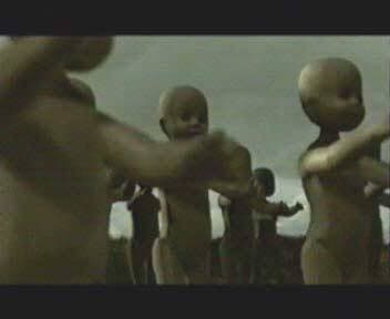 3-мерные модели кукол были воссозданы мной в 3Dstudio MAX по образу и подобию настоящих кукол, отснятых в видеоклипе, затем были специально отсняты на камеру и оцифрованы крупные части тел у кукол для последующего использования этих материалов в качестве текстур. Для кукол была создана гордая и страшная походка типа "Zomby", которой они и прошли через весь клип :). На картинке видно, что куклы наполовину скрыты травой и постепенно выходят на вершину холма, на видео в этот момент трава на переднем плане колышется под действием порывов ветра, и загораживает кукол стебельками. Создание такого эффекта в данном кадре было выполнено даже проще, чем может показаться — если вы обратили внимание, в кадре свет падает таким образом, что небо имеет ярко выраженный светлый оттенок, в то время, как земля и трава, напротив очень темны. Я просто использовал ту же последовательность кадров в качестве маски прозрачности для кукол, просто немного увеличив контрастность видеоряда, а затем использовав эту анимированную маску в AfterEffect для получения необходимого результата.