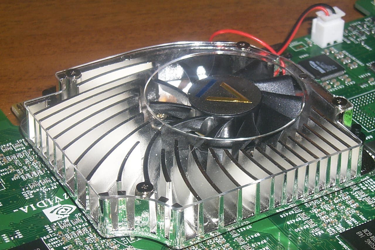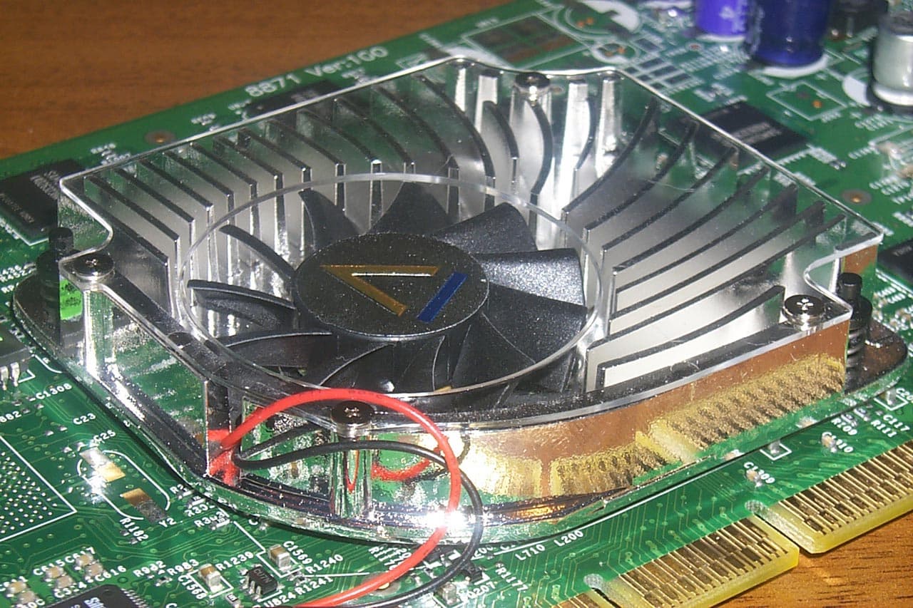 Конструкция самого радиатора стандартна для карт на базе GeForce4 Ti, представляет собой закрытую с двух сторон коробку, в которую вентилятор загоняет воздух, который наиболее сильным потоком проходит над GPU.
