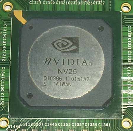 Мы снова видим кодовое название процессора (NV25), что объясняется ранней датой его изготовления — 51-я неделя 2001 года (то есть предпоследняя неделя декабря). Интересно отметить, что практически все чипы NV25/GeForce4 Ti, которые мы могли видеть на рассмотренных уже ранее картах, выпущены достаточно давно. Это может подтверждать наше предположение о том, что GeForce4 был готов уже в течение длительного времени (еще в конце 2001 года), но его анонс был перенесен на гораздо более поздний срок по маркетинговым соображениям.