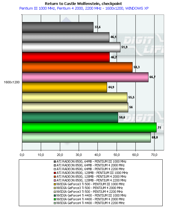 - Return to Castle Wolfenstein (MultiPlayer) (id Software/Activision) — OpenGL, мультитекстурирование, Checkpoint-demo, настройки тестирования — все на максимально возможном уровне, S3TC OFF, конфигурации можно скачать тут;