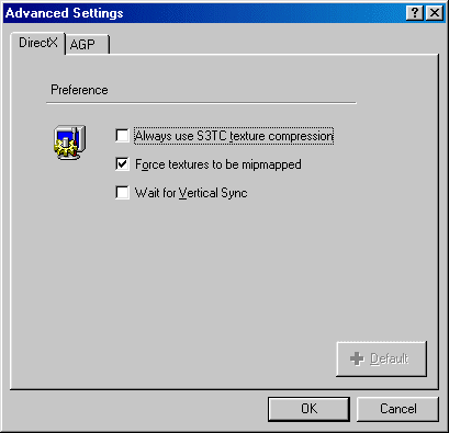 Здесь мы можем управлять включением технологии S3TC, включать Vsync и MIP-mapping, а также устанавливать размер сегмента памяти, выделяемой для нужд AGP.