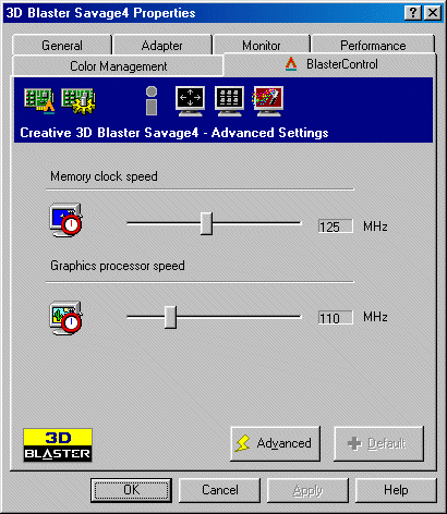 Хотя данный "твикер" от Creative не позволяет задать большие, чем 143/143 МГц, значения частот, в Registry были найдены ключи, отвечающие за их установку. Сразу же скажу, что уже на частотах 150/150 МГц Creative 3D Blaster Savage4 перестала работать устойчиво, поэтому было решено ограничиться разгоном до 143/143 МГц, на которых видеокарта работала стабильно в обоих тестовых системах.