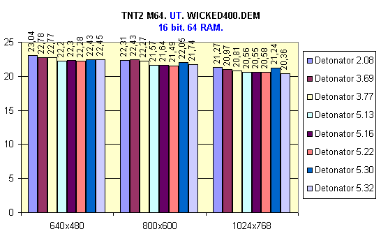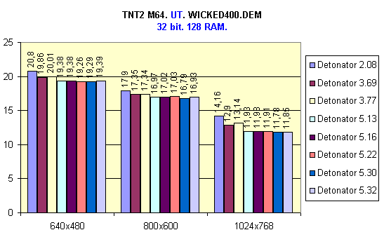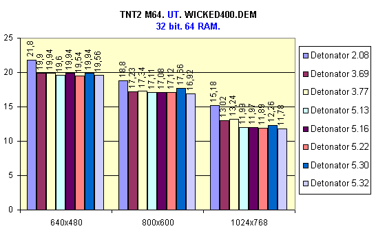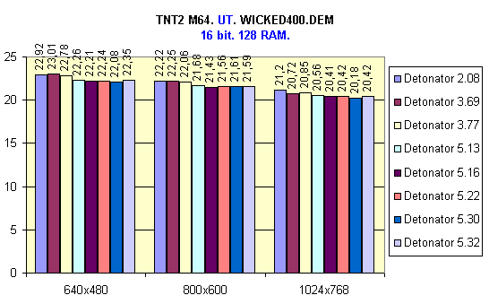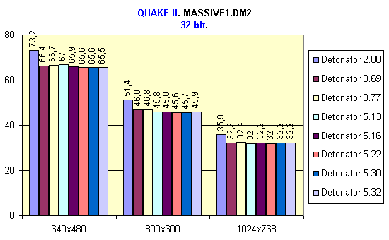 И опять Detonator 2.08 опередил остальных, особенно в режиме 32 bit. Можно также выделить версию 3.69 и, как ни странно, 5.30.