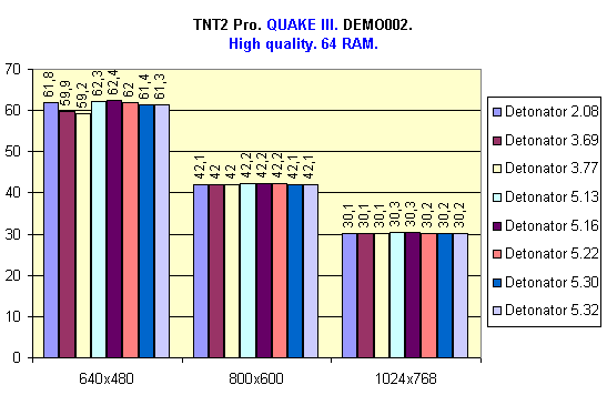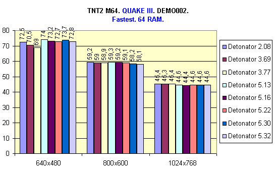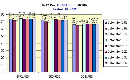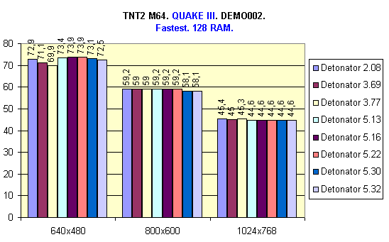 В системе с 64 Мбайт ОЗУ лучшие результаты показали драйверы версий 5.22, 5.30 и 5.32, так как в них есть поддержка режима DiME, однако Detonator 5.22 показал чуть более лучший результат. Также хочу отметить тот факт, что в данном случае (64 Мбайт ОЗУ) большую роль играет скорость передачи данных с жесткого диска, т.к. происходит постоянный свопинг.
