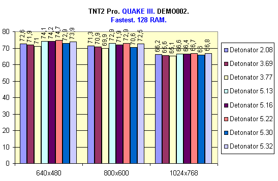 Результаты говорят сами за себя. Как видим, наибольшую скорость дает Detonator 2.08, причем во всех разрешениях. И это драйвер годичной давности! Остальные "участники" показали примерно одинаковые результаты.