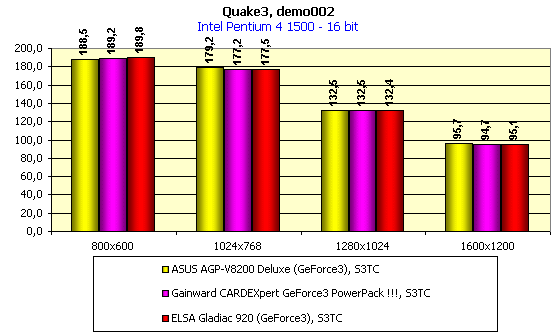Приступаем к оценке производительности видеокарты в 3D. В качестве инструментария мы использовали id Software Quake3 v.1.17 — игровой тест, демонстрирующий работу платы в OpenGL с использованием стандартного демо-бенчмарка demo002.