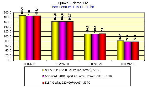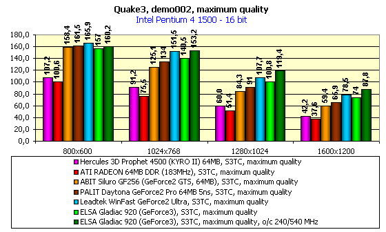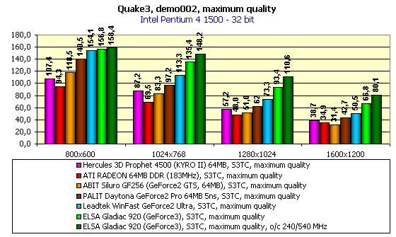 Этот тест нам демонстрирует положение видеокарты на базе GeForce3 (в данном случае, ELSA Gladiac 920) среди других популярных современных акселераторов. Постоянным читателям наших обзоров эти диаграммы не дадут новой информации. А вот тем, кто начал изучать карты на базе этого GPU с чтения данного материала, вышеприведенные диаграммы помогут оценить производительность самой мощной на сегодня видеокарты.