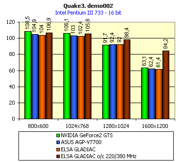 Этих инструментов вполне достаточно для того, чтобы показать производительность видеокарты при работе через два основных API. Для наглядности на диаграммах приведены скоростные показатели еще двух видеокарт: ASUS AGP_V7700 и референс карты от NVIDIA на базе GeForce2 GTS. Также мы покажем, как изменилась производительность видеокарты ELSA GLADIAC при работе на нештатных частотах.