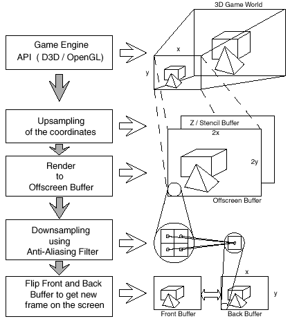 Обычно эти термины используются для обозначения OGSS, но, на самом деле, они просто обозначают то, что всё изображение (целиком) подвергается сглаживанию, будь то OGSS, или RGSS, или что-либо иное. Тем не менее, это важно, что мы упоминаем о том, какой именно тип сглаживания реализован в "железе", потому что его качество невысоко, как выяснится совсем скоро. В итоге, следует заметить, что этот метод реализации OGSS, используя существующие 3D-буферы, страдает от потенциальной несовместимости с приложениями, использующими доступ к буферу кадра. Доступ к буферу кадра производят приложения, которые для какой-либо цели заполняют буфер значениями напрямую (значения цвета и/или Z/Stencil). Проблема в том, что внутренний рендеринг происходит в повышенном разрешении, а приложение вообще об этом не знает, и, в итоге, обращение к буферу кадра происходит некорректно. Это можно увидеть на простом примере. Допустим, игра захотела использовать буфер кадра для наложения кабины на изображение. Накладываемое изображение имеет разрешение конечного изображения, а не разрешение внутреннего внекадрового буфера. В результате, накладываемое изображение с размерами экранного буфера записывается во внекадровый буфер, что, естественно, приводит к некорректному результату. Накладываемый слой заполнит лишь 1/4 нужного размера в финальном. С приложениями, использующими прямой доступ к буферу кадра, нужно работать с особой осторожностью. Проблема может быть решена на уровне драйвера, т.к. не существует аппаратного решения этой проблемы. Излишне говорить, что это приводит к серьёзному падению производительности, но без решения этой проблемы некоторые приложения покажут некорректный конечный результат.