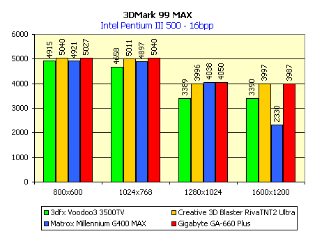 Для оценки скоростных показателей этой карты и проведения сравнительного анализа мы использовали данные по видеокартам: Matrox Millennium G400 MAX, 3dfx Voodoo3 3500TV, Creative 3D Blaster Riva TNT2 Ultra. Их выбор неслучаен. Хотя они и имеют более высокую стоимость, но обладают близкой к Gigabyte GA-660 Plus производительностью.