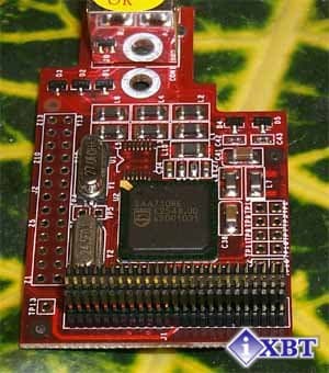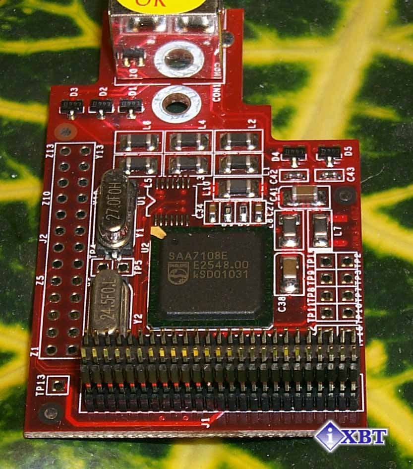 На этой карте и сосредоточены мультимедийные функции. До последнего времени только фирма ASUSTeK выпускала и выпускает Deluxe серию игровых видеокарт, оснащенных функциями приема аналогового сигнала с последующей оцифровкой, а также вывода изображения на ТВ. Плюс поддержка стерео-очков. Карточка от Gainward, конечно, не поддерживает стерео-очки, однако полная реализация VideoIn-VideoOut (VIVO) у нее имеется. На дочерней плате расположен ЦАП-АЦП модуль Philips из серии 7100, который, собственно, и отвечает за преобразования аналогового сигнала в цифровой и обратно.