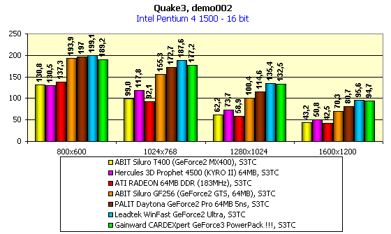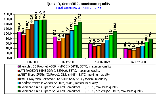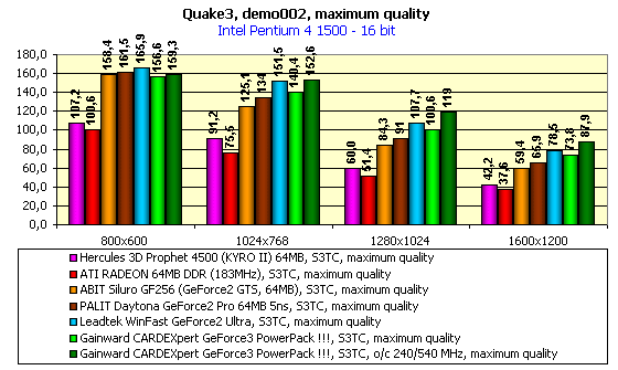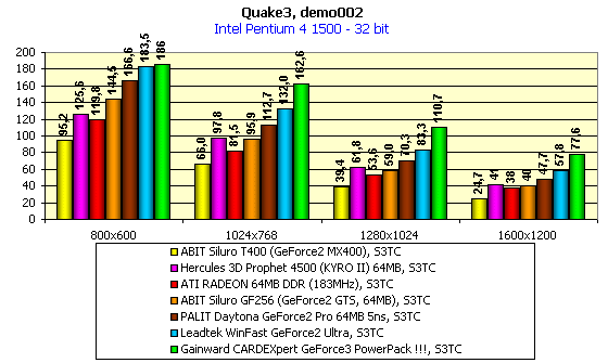 Приступаем к оценке производительности видеокарты в 3D. В качестве инструментария мы использовали id Software Quake3 v.1.17 — игровой тест, демонстрирующий работу платы в OpenGL с использованием стандартного демо-бенчмарка demo002. Учитывая, что обе исследуемые в этом обзоре карты полностью идентичны с точки зрения 3D-графики, в ниже представленных диаграммах фигурирует только одна из них.