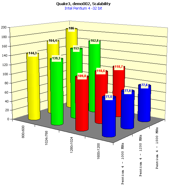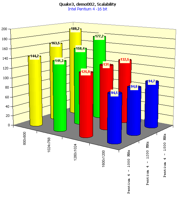 Как видим, в высоких (1280х1024 и выше) разрешениях никакой зависимости от частоты процессора нет, то есть покупаете ли вы CPU на 1000 МГц (разумеется, если бы такие Pentium4 выпускались) или на 1500 МГц — это не играет никакой роли для работы GeForce3 в играх в высоких разрешениях. Да и 1280х1024 можно назвать уже привычным для ранга такой карты.