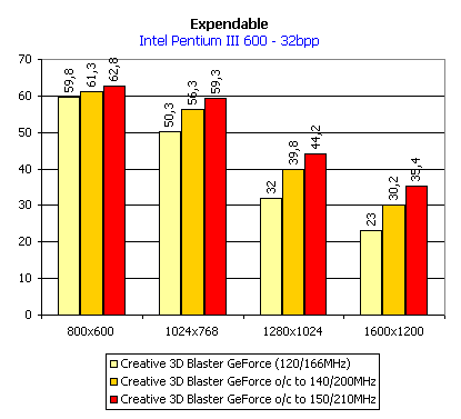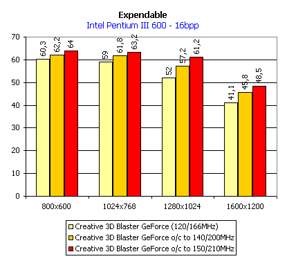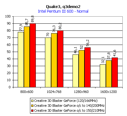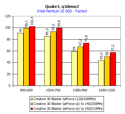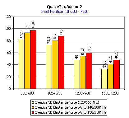 При экстремальном разгоне (прирост по частоте чипсета — 25%, а по памяти — 27%) в разрешении 1280х1024 мы получили повышение скорости на 38% (в разрешении 1024х768 — 18%). Что ж, результат даже лучше, чем можно было ожидать, однако играбельность в 1280х1024 все равно остается на невысоком уровне.