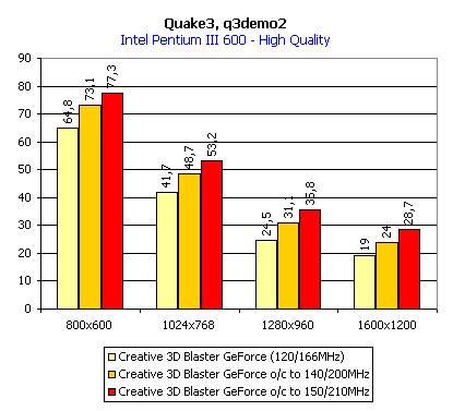 Можем заметить, что почти во всех режимах прирост скорости в процентном отношении идентичен (за исключением Fastest — там уже сказывается ограничение, накладываемое частотой процессора). Посмотрим же на примере режима High Quality (а это 32-битный цвет), оправдал ли себя разгон.