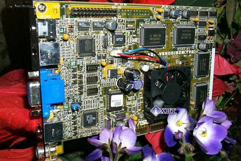 Видеокарта имеет интерфейс AGP 2x/4x, 32 мегабайта 5 ns SGRAM (SDR) памяти, расположенной в 8-ми микросхемах по обеим сторонам платы. Чипсет закрыт установленным на специальном крепеже радиатором с вентилятором, имеющим тахометр. Если кто читал наши обзоры по платам на базе NVIDIA Riva TNT2 Ultra или имел дело с ASUS AGP-V3800 Deluxe, тот знает, что суффикс Deluxe означает у продуктов фирмы ASUS наличие на видеокарте ТВ-входа и выхода, а также возможности подключения к карте 3D стерео-очков ASUS VR-100.