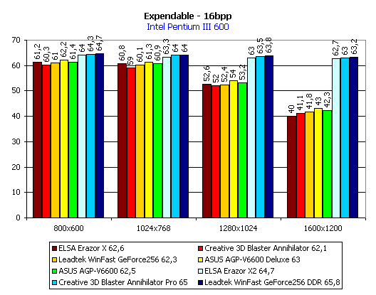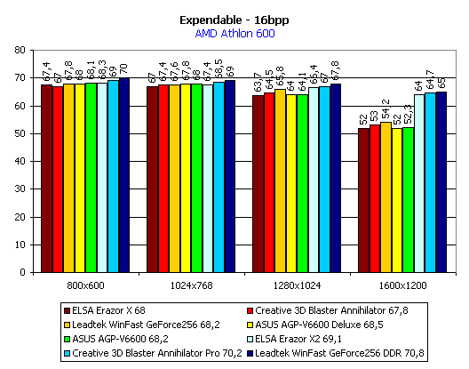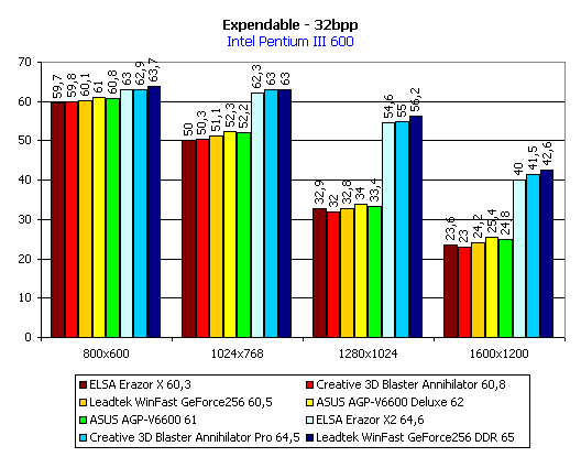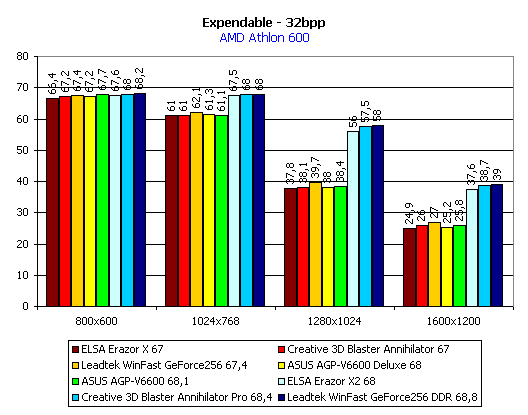 Вывод по Expendable: среди плат с SDR-памятью нет постоянства, кроме лидерства ASUS AGP-V6600, а у карт с DDR-памятью по-прежнему лидирует LeadTek WinFast GeForce 256 DDR.