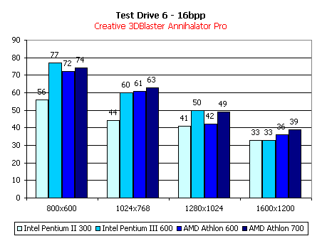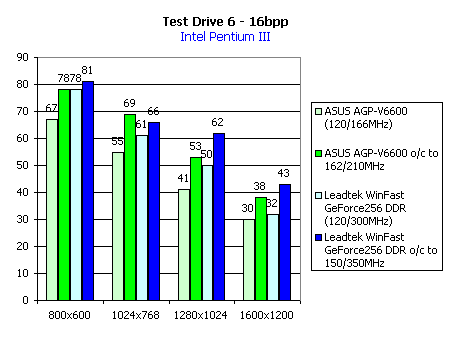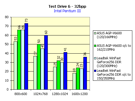 Test Drive 6 мы покажем на примере системы на Pentium III. Для демонстрации эффекта от оверклокинга мы выбрали две наиболее разгоняемых видеокарты с SDR- и DDR-памятью. Также приведем зависимость производительности карт от частоты процессора.