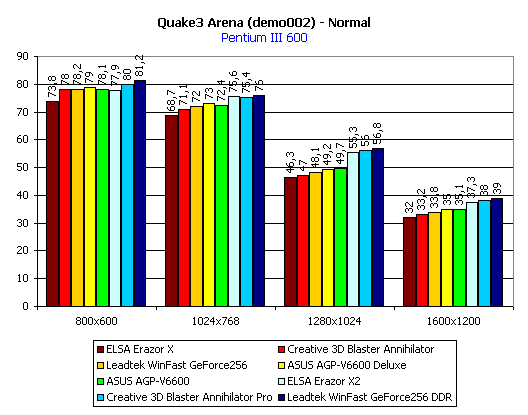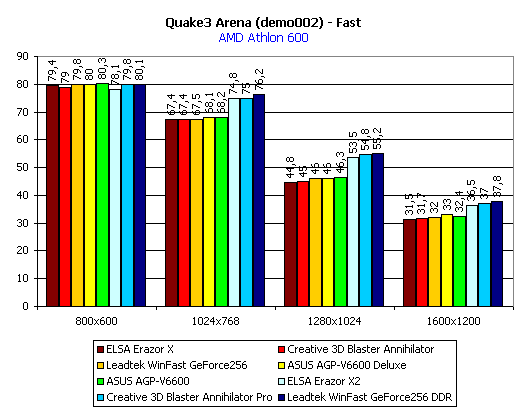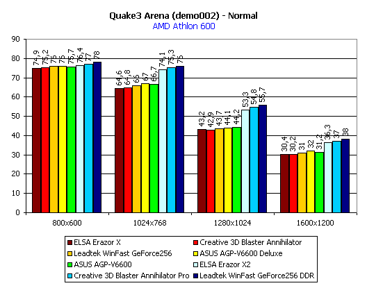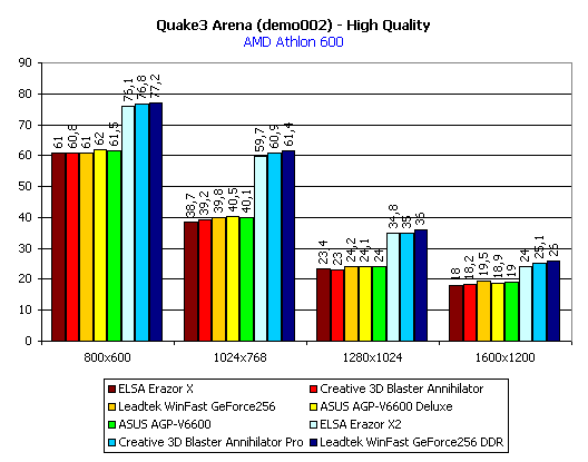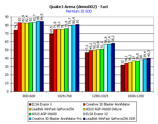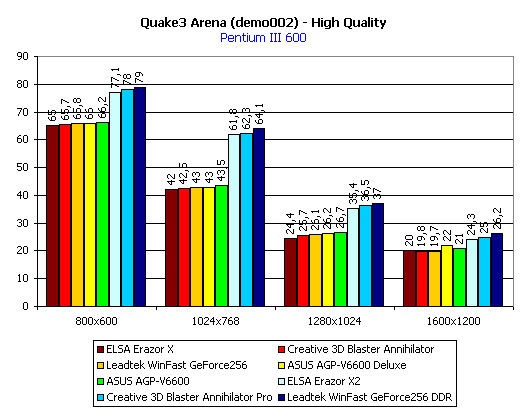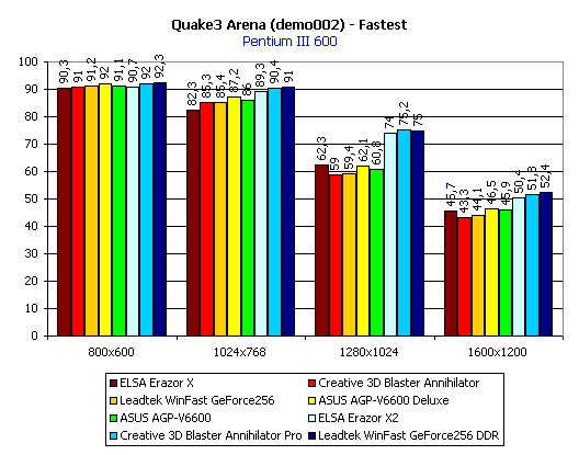 Итог по Quake3: среди плат с SDR-памятью лидируют обе карты от ASUS, а среди плат с DDR-памятью — Leadtek WinFast GeForce 256 DDR. Почти везде аутсайдером является ELSA Erazor X.