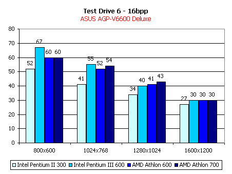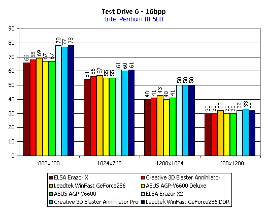 - Accolade Test Drive 6 (встроенный бенчмарк) — игровой тест, демонстрирующий работу видеокарт в Direct3D при использовании аппаратного T&L.