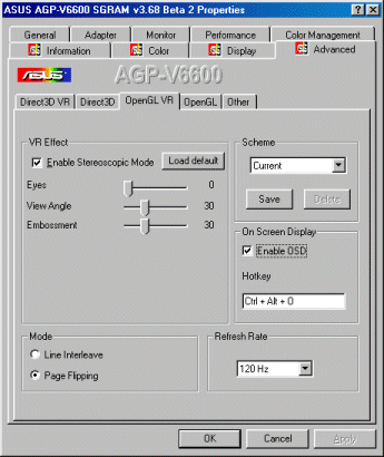 При установке последней версии драйверов от ASUS v.3.66 beta2 в настройках стерео-очков есть присутствуют две закладки: Direct3D и OpenGL, поскольку эти очки позволяют получать стерео-эффект в обоих этих API. Конструкция очков схожа с описываемыми нами ранее очками от ELSA — Revelator 3D. То есть, линзы очков попеременно закрываются с частотой 60,70 или 75 Гц, а на экране монитора с той же частотой чередуются картинки для левого и правого глаза: