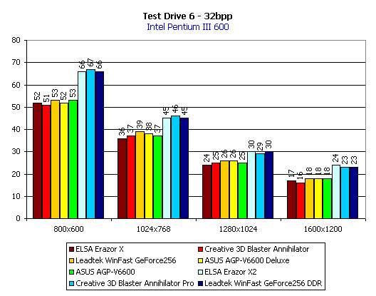 Чтобы сделать комплексный вывод по всем видеокартам на NVIDIA GeForce 256, прошедшим у нас тестирование, мы включили в представленные ниже диаграммы и ранее рассмотренные видеокарты.