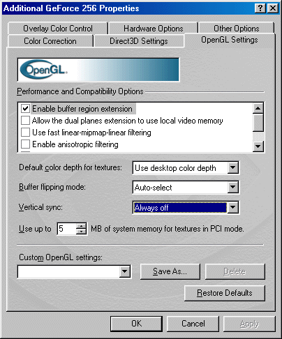- выбор глубины цвета текстур при работе с OpenGL приложениями (по умолчанию — та глубина, которая установлена на рабочем столе)