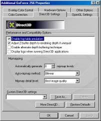 Текущие настройки можно записать в виде схемы под определенным именем. Ниже идет кнопка "More Direct3D", которая вызывает следующую закладку.