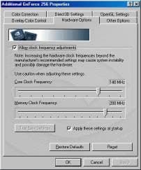 Эта закладка появляется только после внесения изменений в Registry, о которых говорилось выше. На этой странице мы можем разогнать видеокарту, повысив частоты на чипсете и памяти (до +25% от номинала). При этом надо иметь в виду, что если вы вдруг превысили частоты настолько, что и при загрузке Windows происходит зависание, то можно при загрузке GUI Windows удерживать клавишу Ctrl, что позволяет при инициализации драйверов сбросить частоты до номинальных значений.