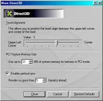 Далее, при работе с отключенным режимом AGP-текстурирования можно жестко задать, какую часть видеопамяти имеют право занимать текстуры. По умолчанию — практически всю, т.е. происходит динамическое выделение той памяти, что осталась свободной после использования фрейм-буфером и Z-буфером.