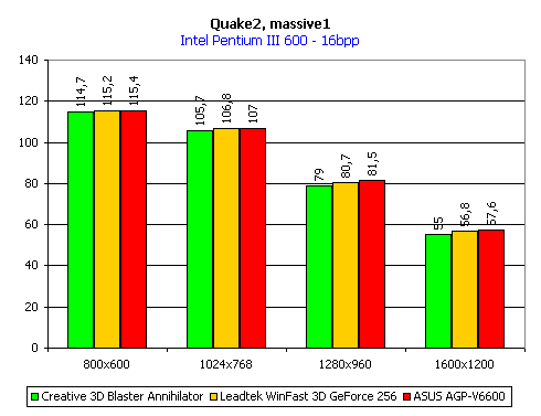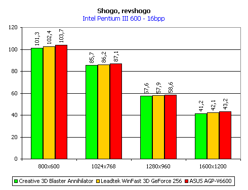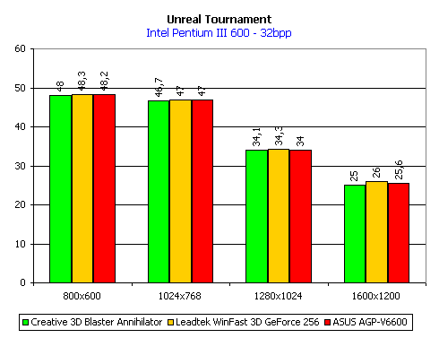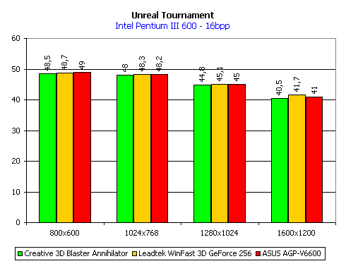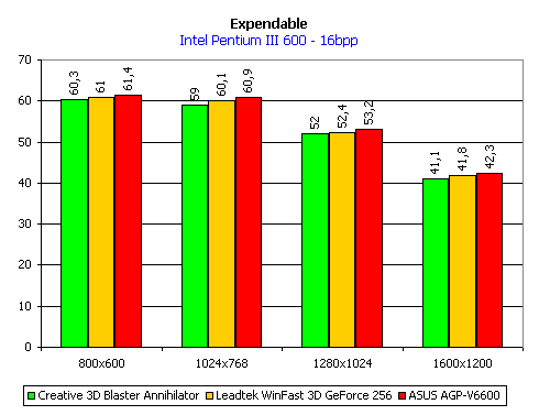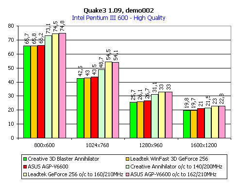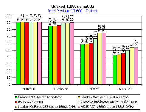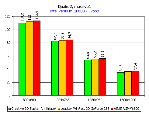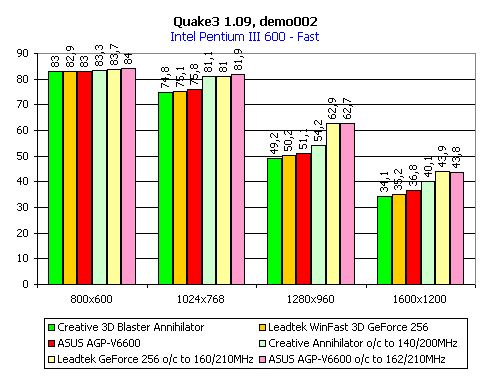 Легко заметить, что картина почти во всех разрешениях — однородная: ASUS AGP-V6600 является лидером, почти на равных с ним — Leadtek WinFast GeForce 256, а Creative 3D Blaster Annihilator несколько отстал.