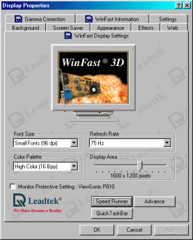 Драйверы, поставляемые с платой, базируются на NVIDIA reference 3.48, которые кроме общепринятых в reference драйверах функций имеют свою закладку по выставлению разрешений и частот регенерации:
